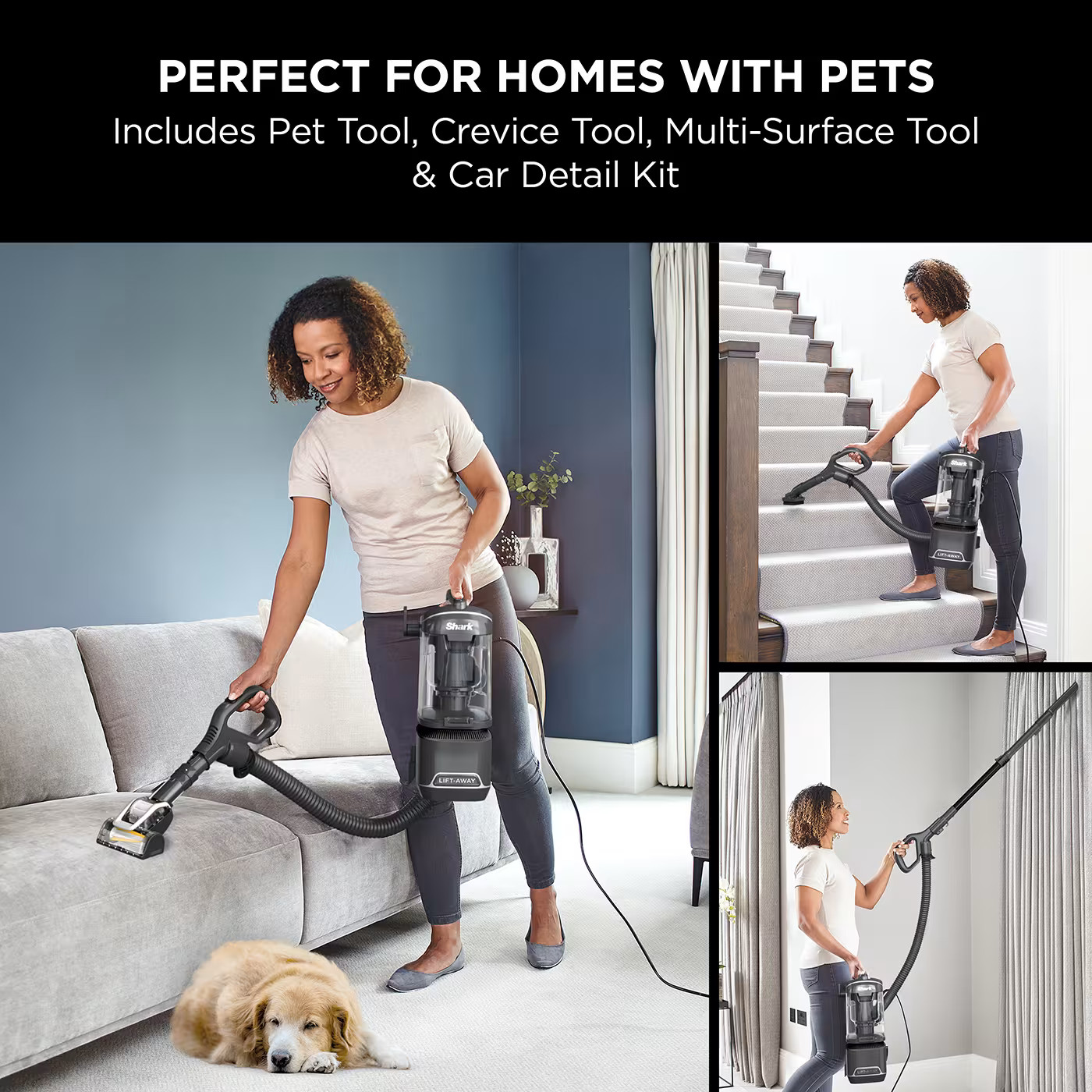 Introducing an exclusive Deluxe Black upright vacuum from Shark. Instantly transform this upright into a lightweight, portable vacuum with Lift-Away. Simply lift the detachable pod away from the floorhead to comfortably clean stairs and soft furnishings in portable mode, and reach up high with the wand.
